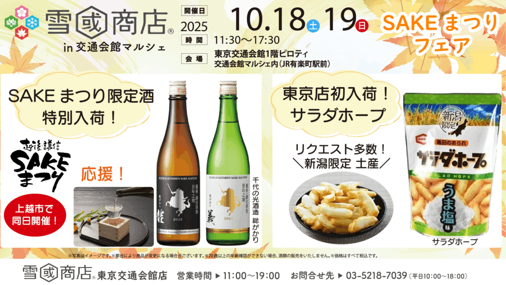 今週末10月18日(土)・19日(日)、交通会館マルシェにて、「SAKEまつりフェア」と称して、各酒蔵の限定酒を特別販売いたします!