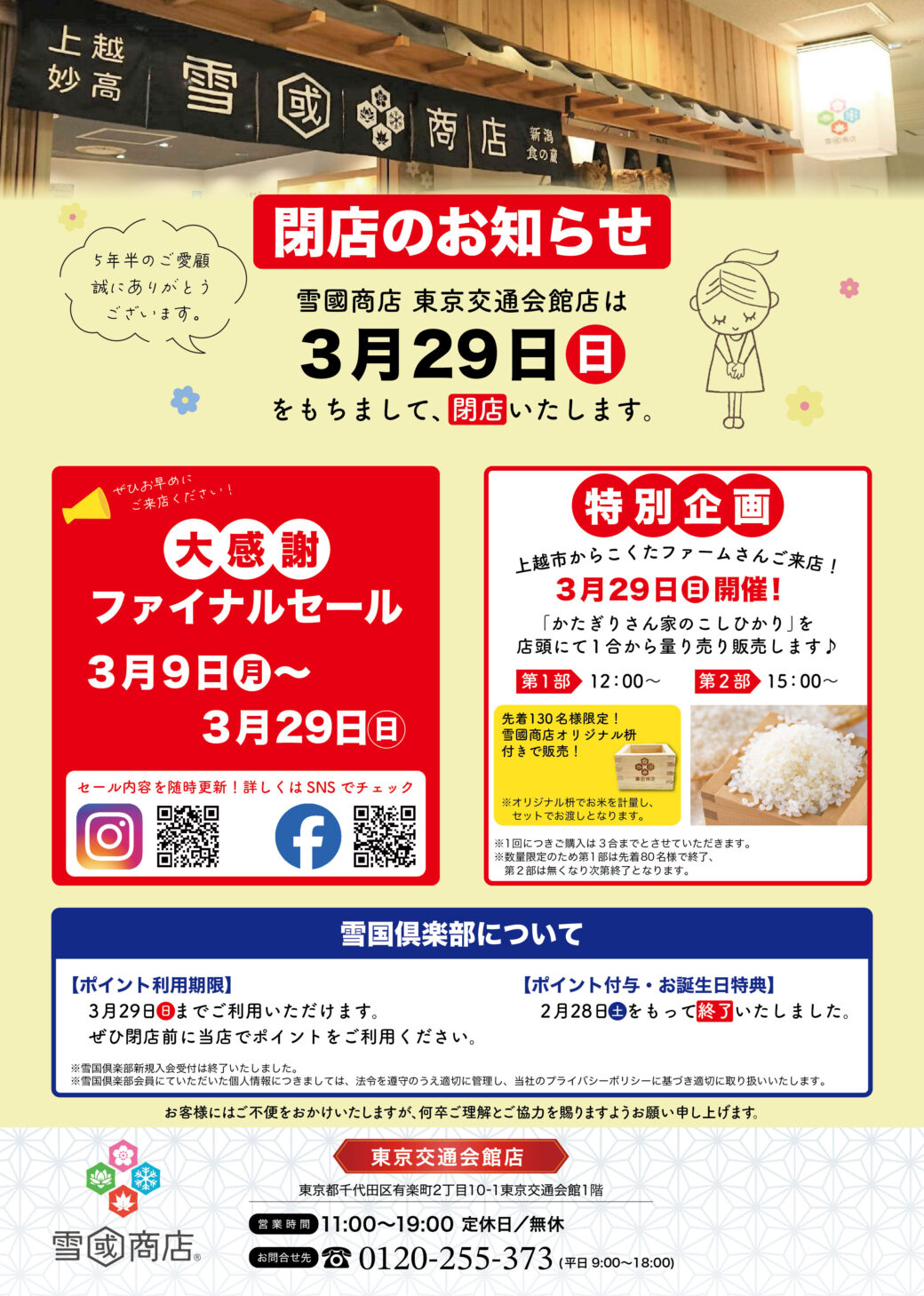 雪國商店東京交通会館店は、3月29日(日)をもちまして閉店いたします。